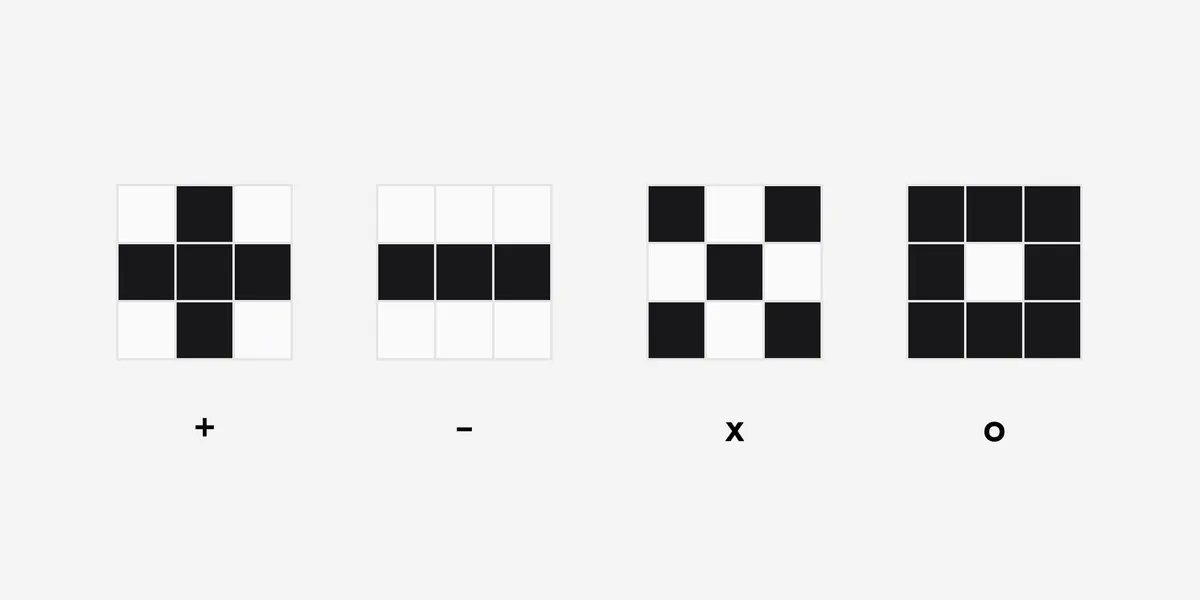 Imagine que queiramos treinar um computador para resolver o simples problema de reconhecer símbolos em uma tela de 3x3 pixels.